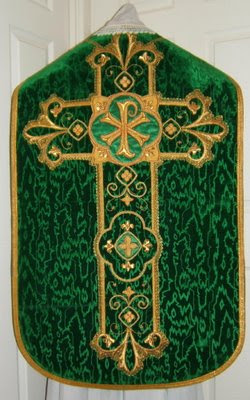 Casula com cruz trífida, que nasce como uma faixa indo até o pescoço, ramifica-se nos ombos e volta a juntar-se nas costas.