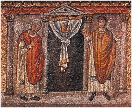 Mosaico do século VI em Ravena retratando a passagem bíblica da oração do fariseu e publicano, representados com trajes civis romanos.