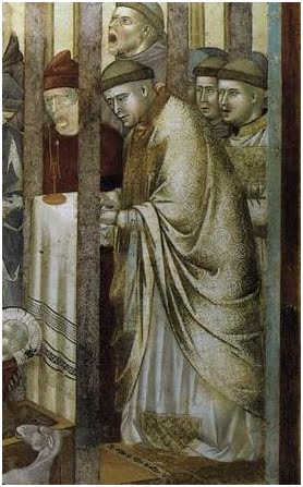Detalhe de um afresco de Giotto na Basílica de São Francisco em Assis, século XIV. Nela vemos um presbítero usando uma casula gótica ricamente decorada.