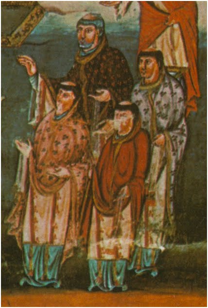 Pintura do Saltério de Carlos, o Calvo, século IX. Nela podemos ver as casulas dos Bispos com encurtamento frontal.