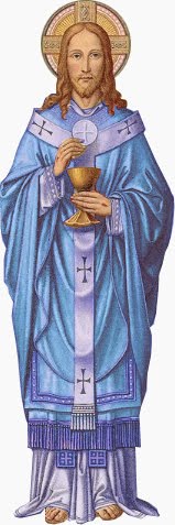 Representação de Cristo com vestes pontificais, indicando assim que é o Sumo-sacerdote. Ele usa alva, estola, tunícela, dalmática e, sobre tudo isso, a casula.