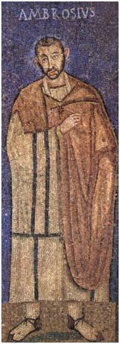 Mosaico do século VI retratando a corte do Imperador bizantino Justiniano I, Basílica de São Vital, Ravena. Note-se que já é possível distinguir os trajes civis dos eclesiásticos. O Arcebispo Maximiano é o único a estar vestindo a paenula.