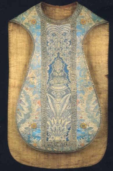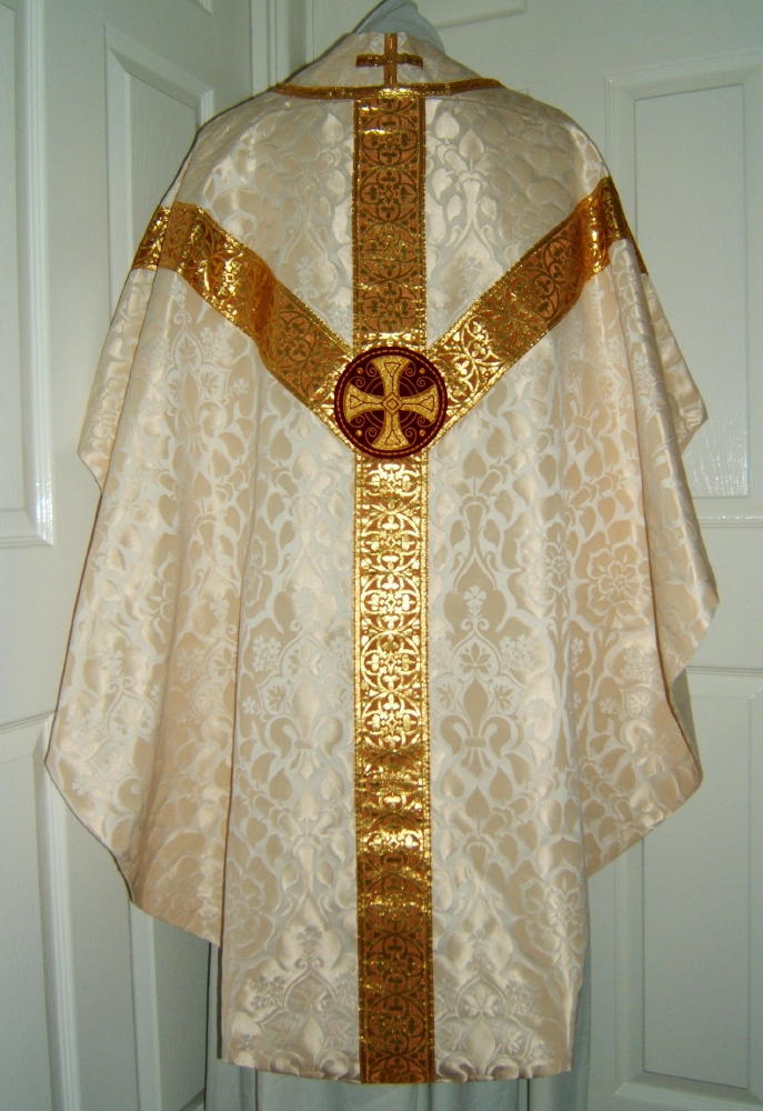 Casula com cruz trífida, que nasce como uma faixa indo até o pescoço, ramifica-se nos ombos e volta a juntar-se nas costas.